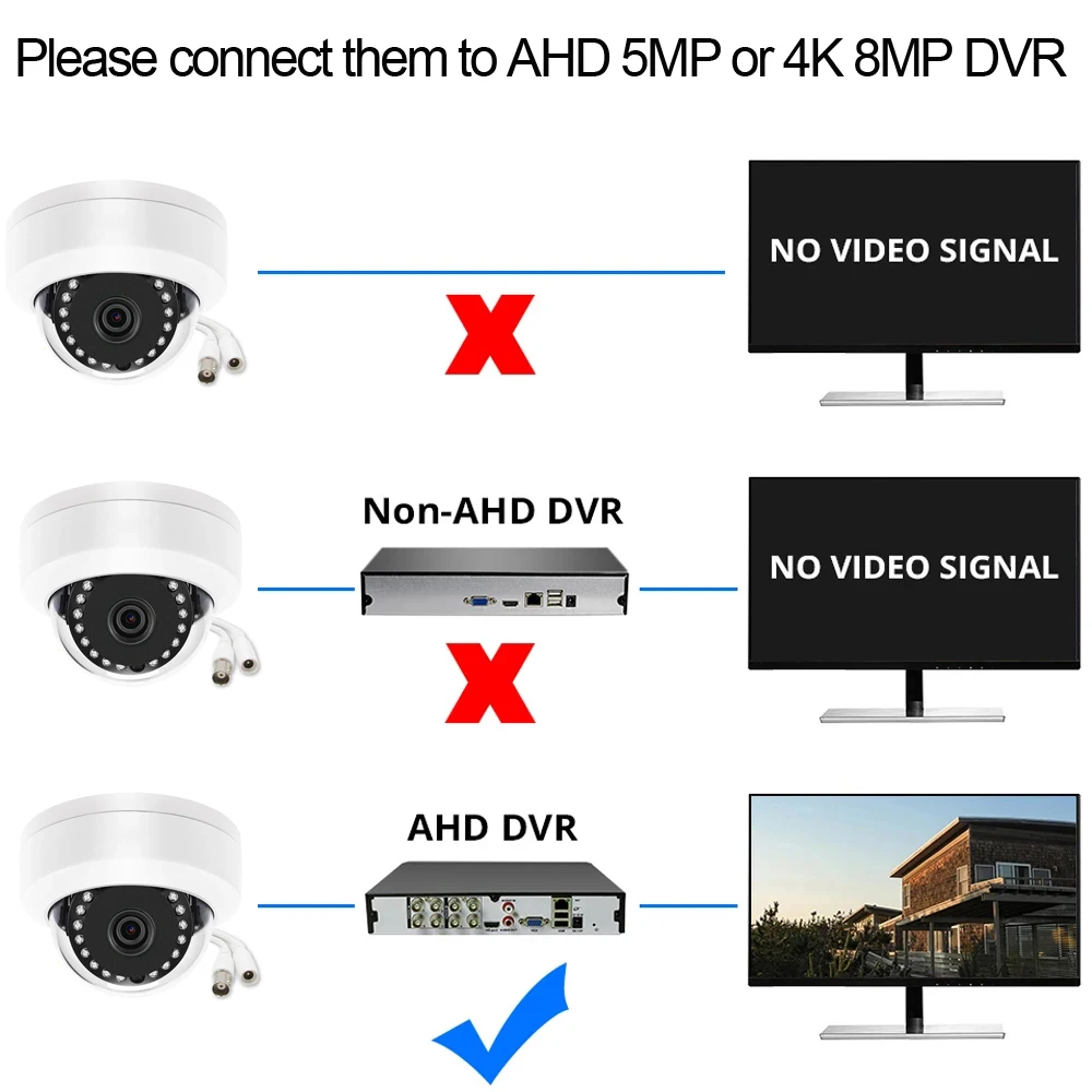 Très important : la caméra AHD 5MP peut fonctionner avec les DVR AHD 5MP et 8MP 4K, mais la caméra AHD 8MP 4K ne fonctionne qu'avec le DVR AHD 8MP 4K, les caméras ne fonctionneront pas si la résolution du DVR est incorrecte, il est facile de trouver le bon DVR dans notre magasin ou de sentir N'hésitez pas à nous contacter