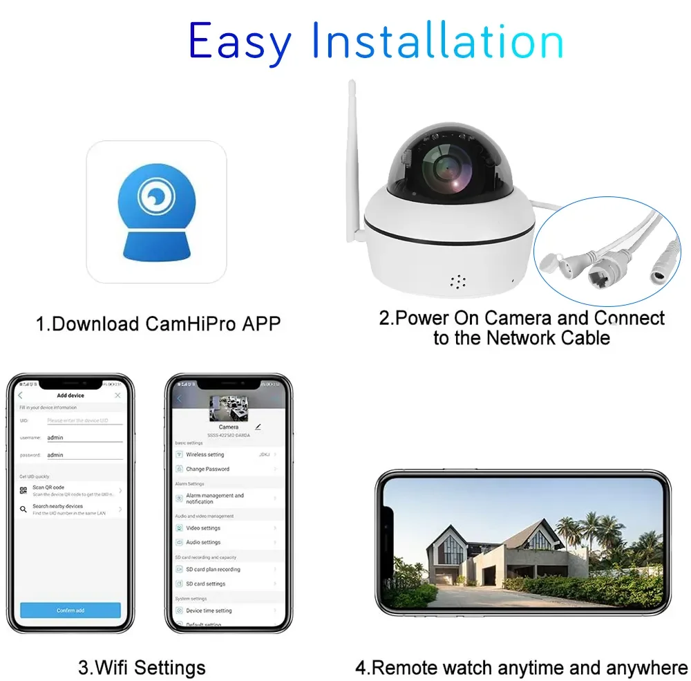 Caméra PTZ sans fil H.265 Onvif IP66 étanche pour l’extérieur et l’intérieur avec objectif 3.6mm Zoom numérique 4X Caméra de surveillance vidéo CCTV IP CamHi / CamHipro App.
