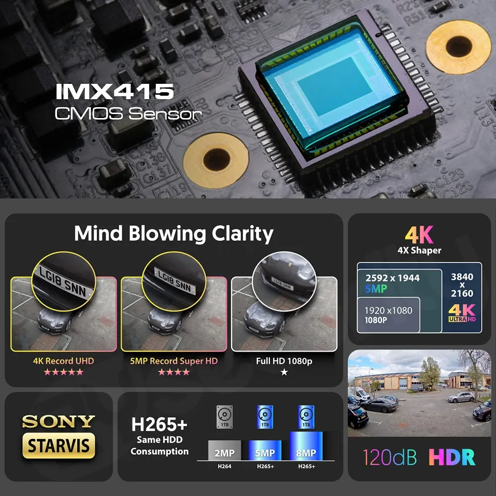 Puce Starvis CCD IMX415 intégrée, mise à niveau de la vision nocturne et de l’imagerie à faible luminosité, avec objectif d’ouverture F2.1 et 3D NR (réduction du bruit), technologie DWDR (Digital Wide Dynamic Range), voir clair tous les détails, même dans le rétro-éclairage et la nuit.