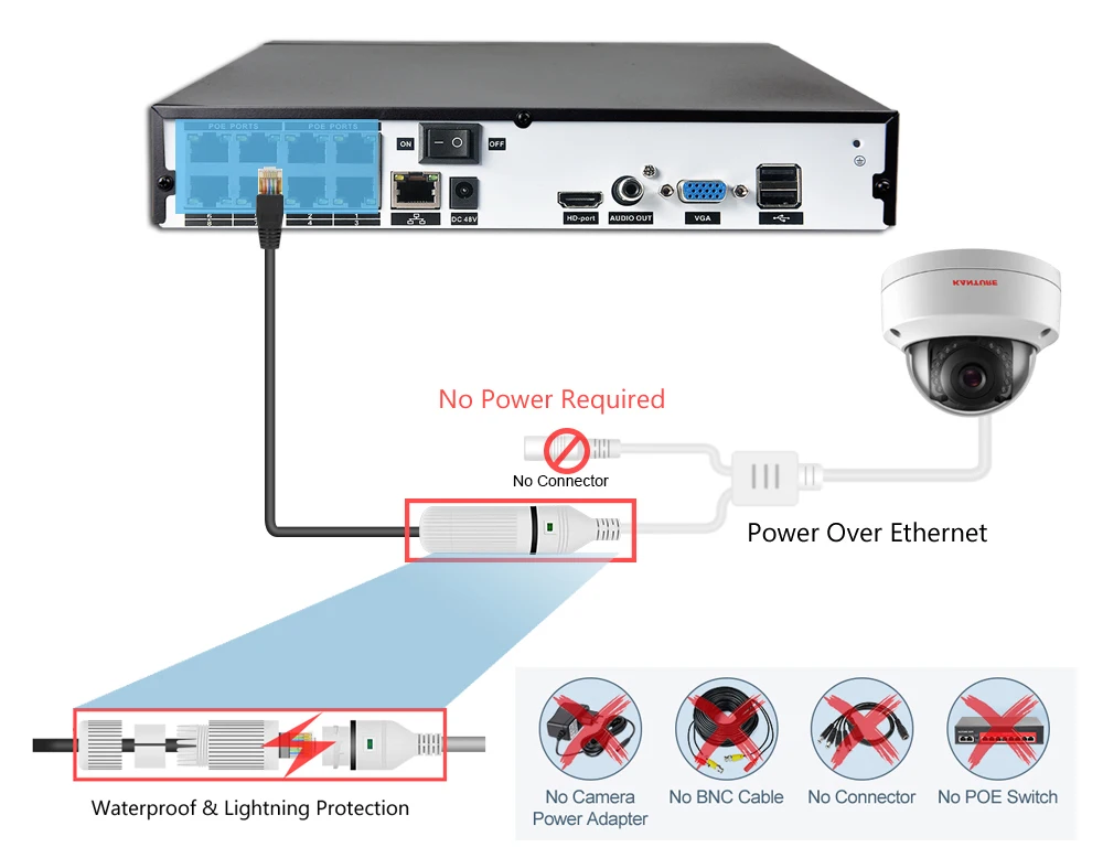 Le Power over Ethernet (PoE) est une technologie de pointe, qui vous permet d’utiliser un seul câble réseau pour la vidéo et la transmission de puissance, installation plus facile! De plus, grâce à PoE, vous ne vous inquiétez jamais des fuites électriques!
