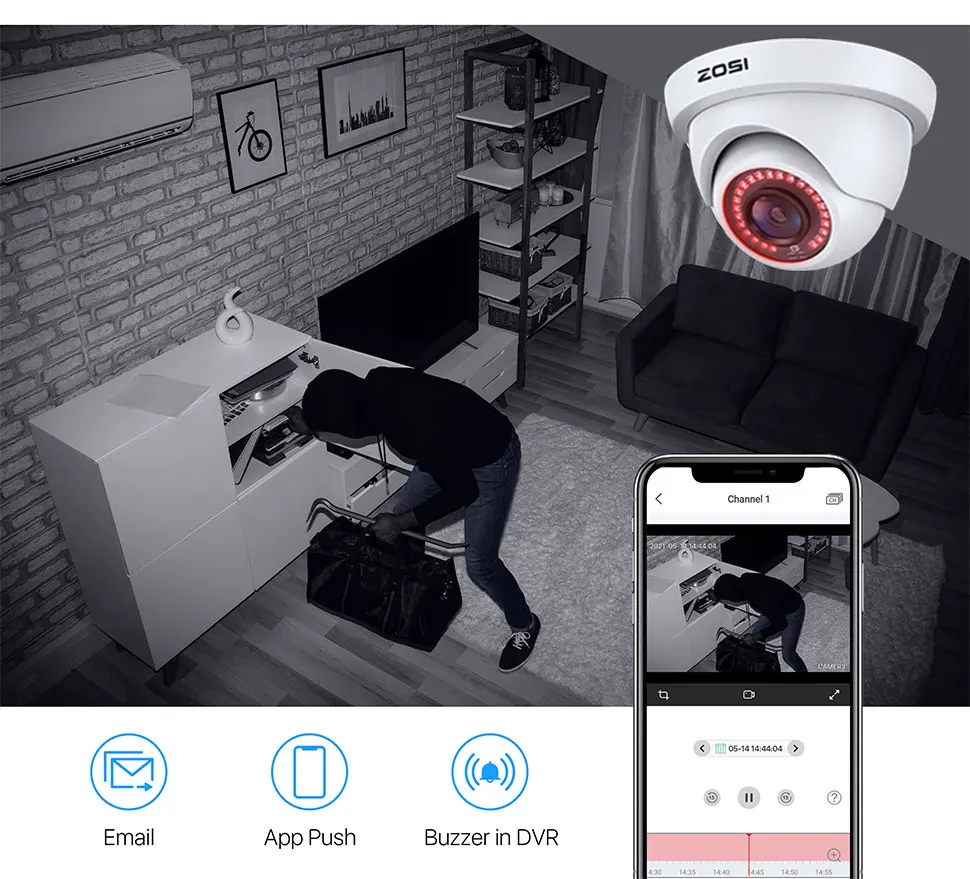 Détectez les objets en mouvement et déclenchez des alertes en cas de danger. Vous recevrez des alertes instantanées sous forme de courriels, de notifications push d’application et d’alarmes sonores dans le DVR lorsque l’invasion se produit. Vous pouvez également configurer des zones de mouvement spécifiques et régler la sensibilité pour réduire les fausses alarmes inutiles.