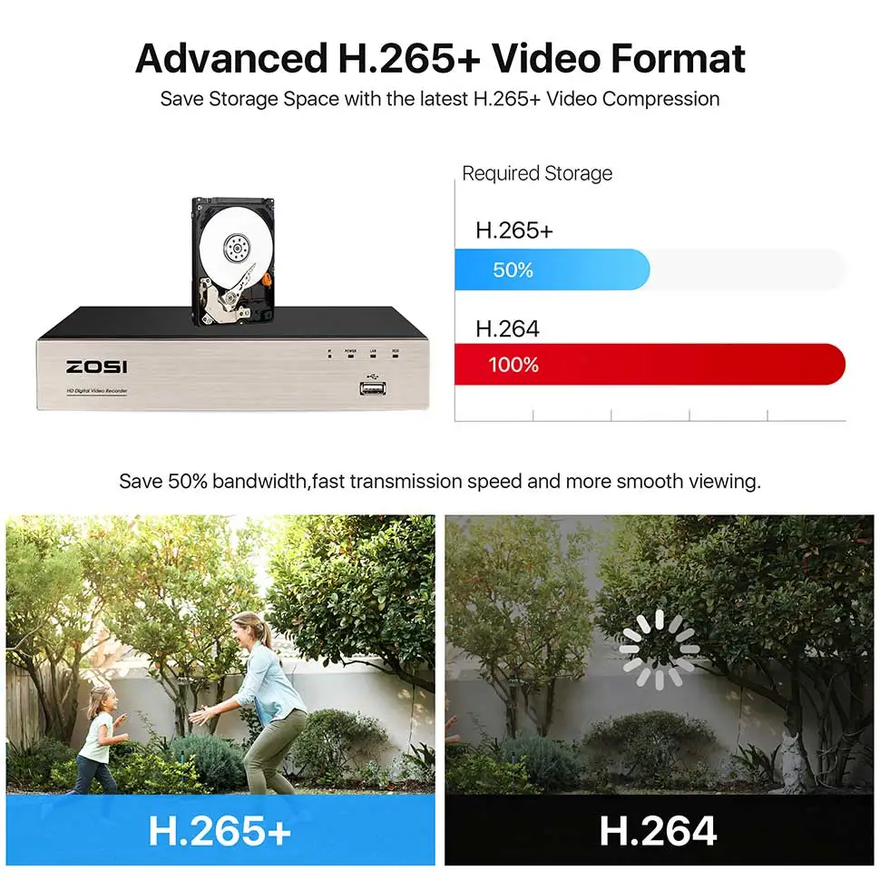 La dernière technologie de compression H.265 + réduit la taille des fichiers vidéo, économise de l’espace précieux sur le disque dur et offre une expérience de visualisation excellente et fluide.