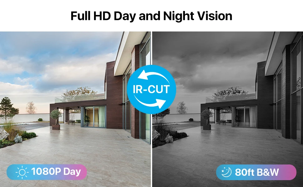 La caméra de sécurité ZOSI 1080P offre jusqu’à 80 pieds de vision nocturne dans l’obscurité totale et surveille clairement la vision dans l’obscurité pour protéger votre sécurité. Vision nocturne jusqu’à 130 pieds en lumière ambiante.