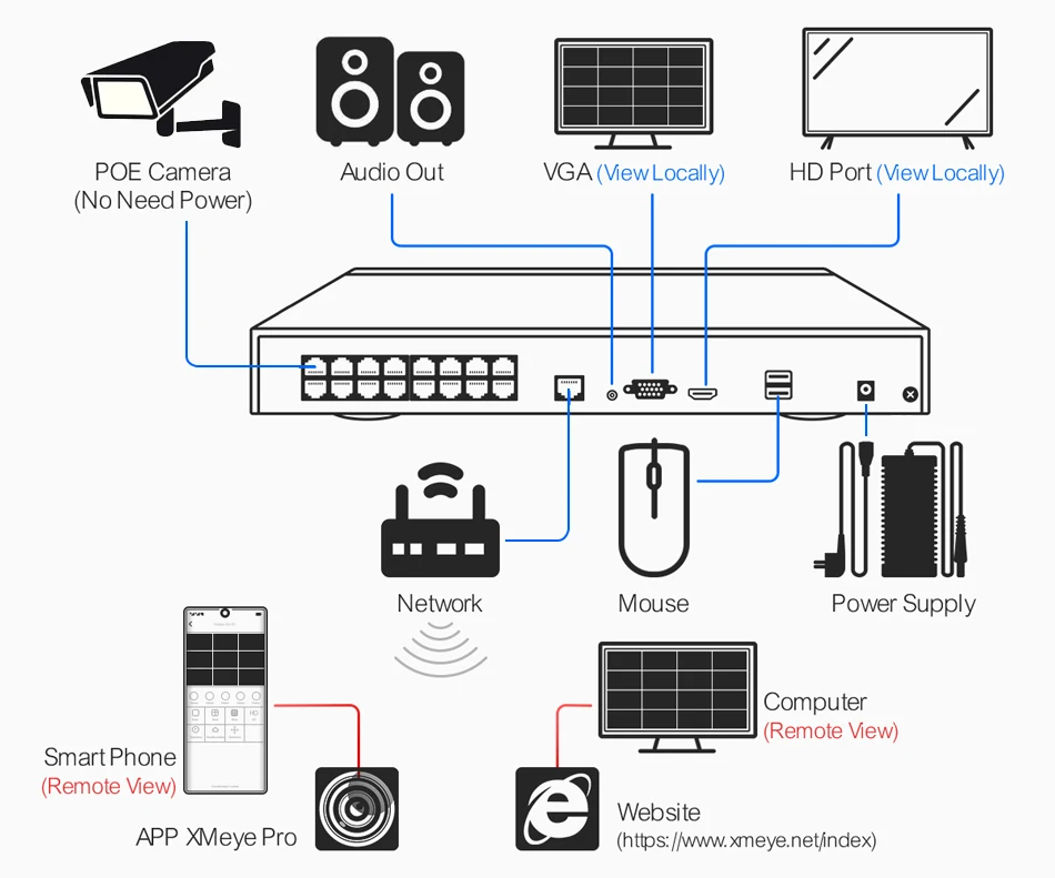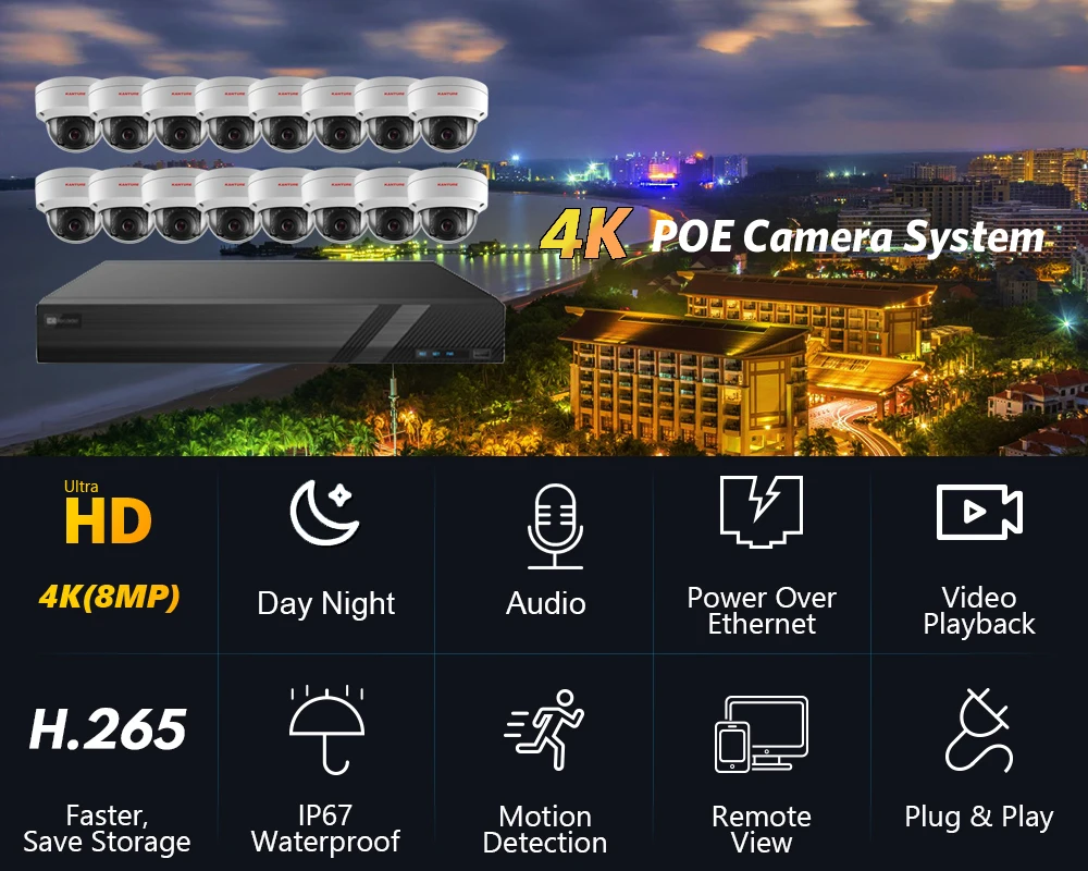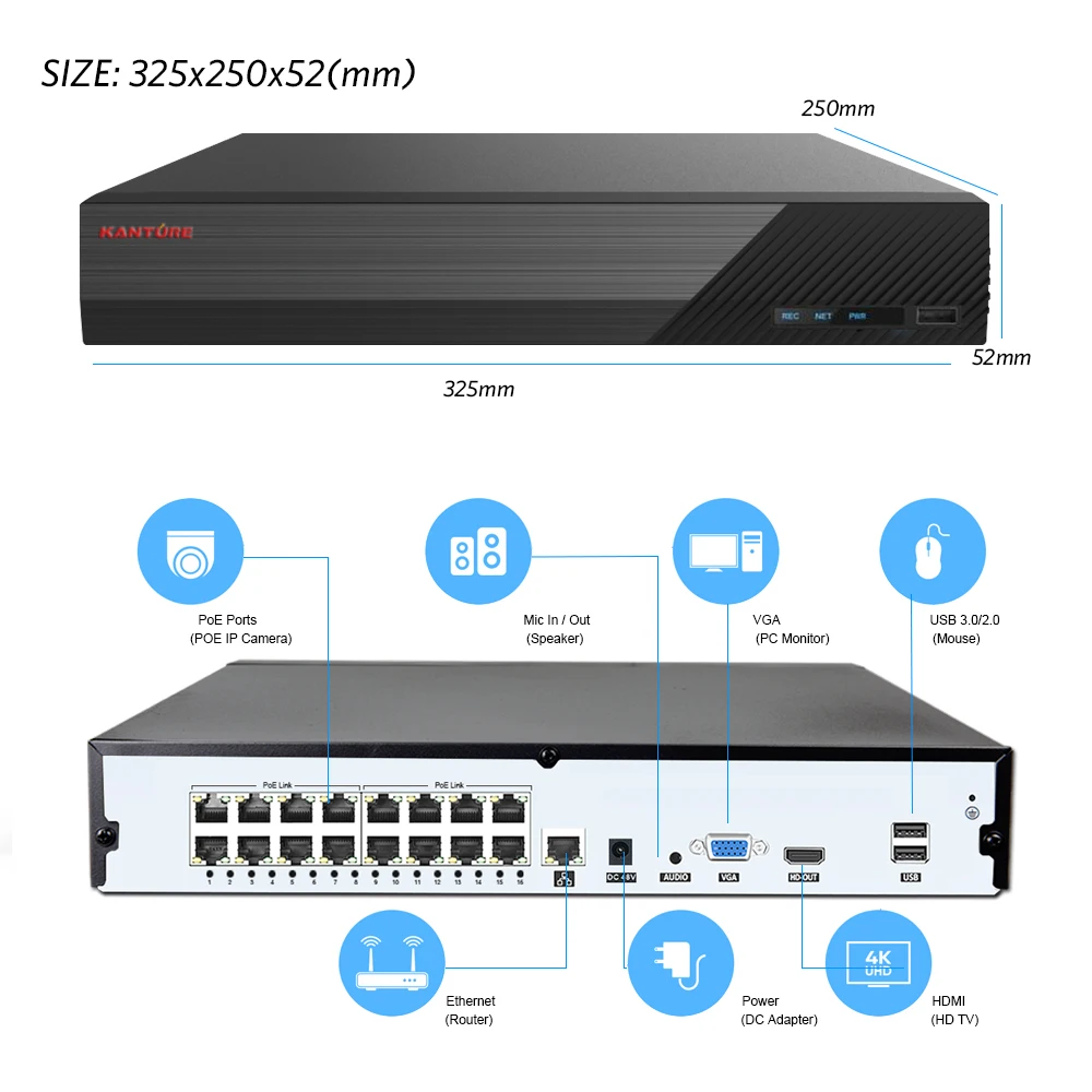 - H.265 48V POE Video: H.265 16CH 4K POE NVR